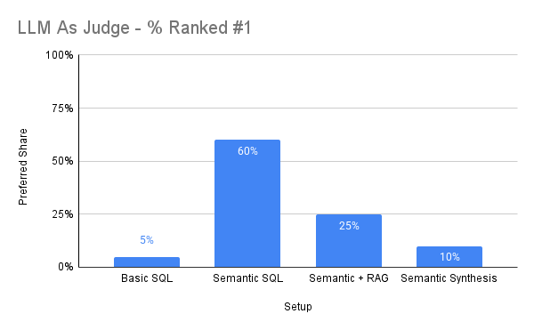 Semantic SQL alone being the overall preferred result is a function of the relationship between the data in the SQL database and the documents in the document store. I scraped topically relevant stories from DJ Mag but there wasn’t an inherent link between these stories and the data in the SQL database. As a result, I struggled with getting a semantic + RAG answer that felt related. To state the obvious, there needs to be a strong semantic relationship between the SQL database data and the document store data, otherwise the model will struggle to find relevant chunks for retrieval.