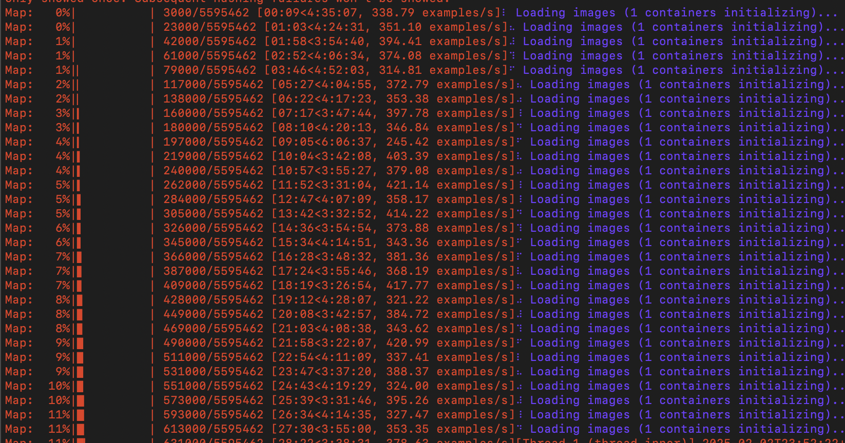 The logs in my terminal show a slow and steady mapping process underway. I don't believe my code currently uses parallel processing effectively, which I suspect is the source of the slowdown. I'll need to read through more documentation and try and determine where the issues lies.