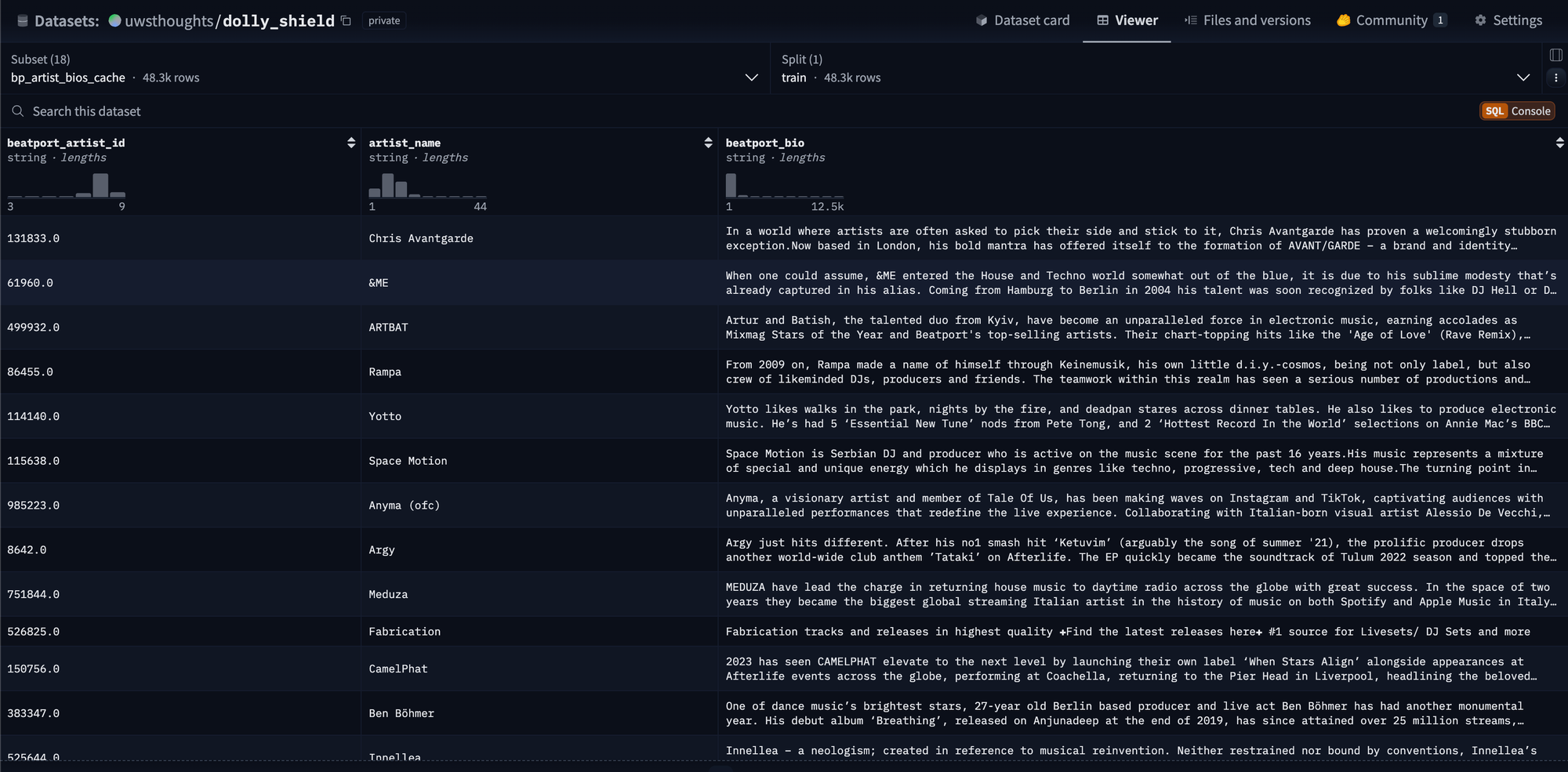 Dolly Shield Part Two involved a lot of reconfiguring the infrastructure based on the lessons learned in Part One. I've been slowly mastering the basics of deploying an app on Modal, a serverless cloud infrastructure provider. My datasets? Now stored in a private repository on the Hugging Face datasets hub, allowing me to use the Hugging Face dataset mapping and transformers tools more effectively. Number of new errors encountered? Priceless.
