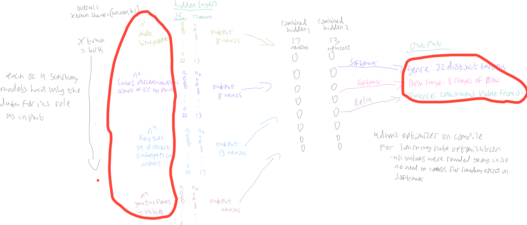 On this drawing below, I've circled two parts in red: the X-input features I knew I wanted to start with and the three output features I knew I wanted to end with. Everything in between I iterated through as I implemented best practices.