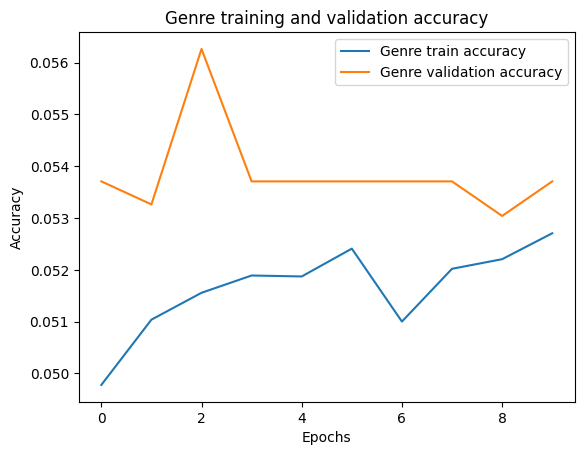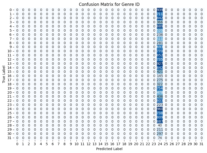 - Uses the Softmax activation function with the CategoricalCrossentropy losss function since it's a one hot encoded categorical output, where each genre is a category